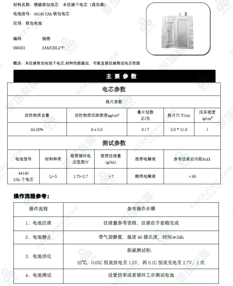 44140软包干电芯 2Ah锂硫软包电芯 未注液干电芯 可定制 深圳科晶