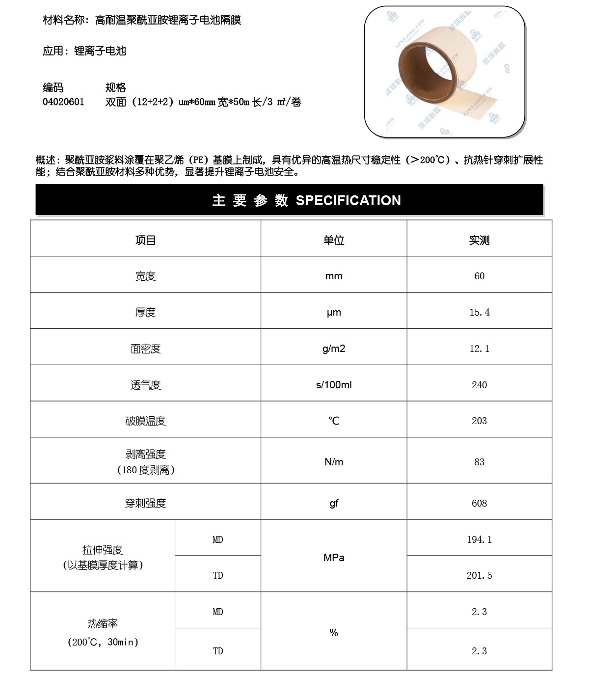 PE基材涂双面聚酰亚胺隔膜 锂电 钠电 耐200度高温 深圳科晶